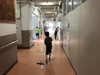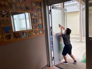 掃除の時間です。扉を挟んで2人で呼吸を合わせてジャンプして間のガラスを両側から拭いている2人、ただの掃除に工夫と楽しさを加える事で、自ら一生懸命に取組む掃除になりました。校長室や職員室の前の廊下は皆3年生がきれいにしてくれます!
