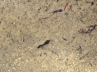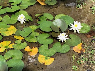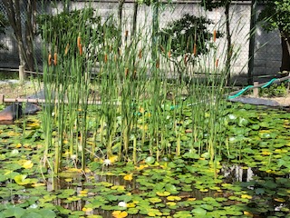 ビオトープが和の風情です。ハスの花が夏空の下白く映え、ガマの穂でしょうか、「因幡の白兎」の話を想い浮かべる水草が程よく生い茂っています。ここはメダカの巨大コロニーができているようで、人影がさすと、逃げ惑うメダカたちで水面があちこち揺れます。真ん中の写真には、7〜8匹ほどのメダカが写っています。
