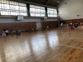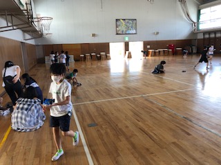 体育館にいるのは5年生、自分で組み立てた電池で動く自動車を走らせてみる実験です。社会につながる学習です♪