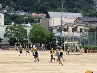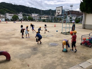 20分休みの運動です。今日は1、3、6年が出ています。1枚目の写真に外へ出て子どもたちと遊んでいる、今日の先生2名が写っています♪