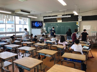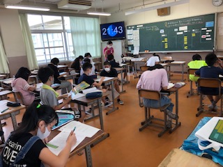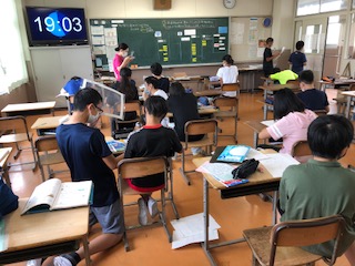 6年の授業です。算数は、理解を深めるプリントが準備され、まず独力で、学び合いもあり、です。分割で少人数授業、とても集中しています。英語は、それぞれでビンゴシートを作ります。先生が言いそうな単語を使って書いてね、で作業スタート♪