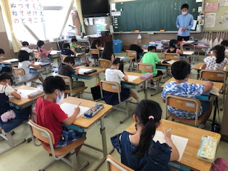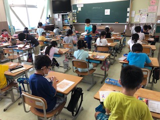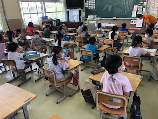 午後まで授業がありました。1年では、引っ越すお友だちにメッセージを書いたり、早速算数の学習をしたり、給食当番の確認をしたり、という様子でした。