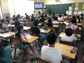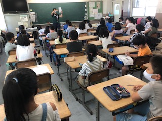 4年生はどちらのクラスも図画工作、紙をハサミで切り目を入れてパクパク開く口を作成です。