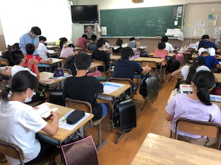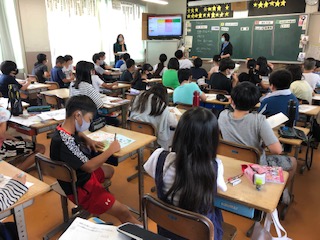 6年生の教室です。栄養教諭の先生と家庭科の先生のティームティーチングです。隣のクラスでは、理科のテスト、どちらのクラスも静かに集中しており、さすが6年生です♪