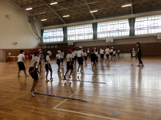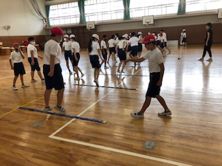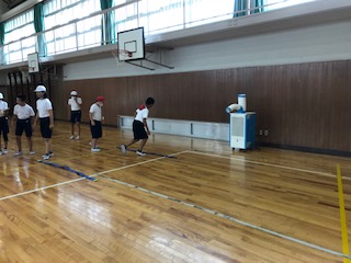 体育館へ行ってみると6年です。リズムジャンプ運動を準備運動としてやっています。昨日先生方が何人か研究活動をしていましたが、早速やっているようで、楽しそうです。体育館には、写真に写っているように、スポットクーラーを2台入れています。体育館の広さを考えると十分ではありませんが、熱中症対策です。
