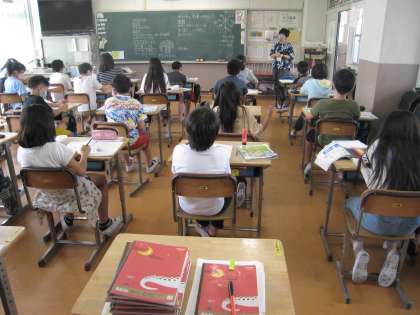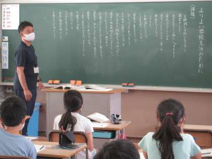 5年の授業です。道徳の「より良い学校生活のために」を自分事として考え、今の学校の中での課題を挙げていきます。黒板にたくさん書かれていて、ちょうど手をあげた人が、「言葉づかいが悪いこと」と発表しました。隣の教室では、理科の授業で「雲」についての学習です。東西南北の4方位に加えてその間の北東、南東、北西、南西を知り、8方向を使って考えます。