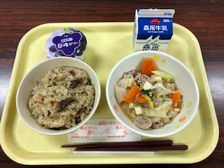 今日の給食は豪華です。にくめしは、柔らかい赤身の牛肉がたくさん入っています。教室でのお代わり希望が多いことでしょう。やっこ煮は、豆腐がいっぱい入っていて、糸こんにゃくや野菜とあっさりヘルシー、豚肉も入っています。ぶどうゼリーのデザートが嬉しい♪いただきます。