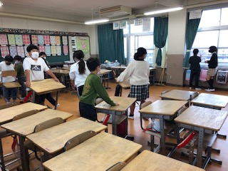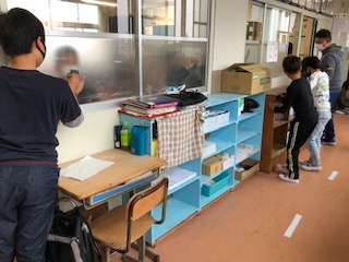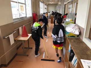 掃除時間の5年生、机運びやほうき、窓拭き、黒板…それぞれの分担をテキパキとこなしていきます♪