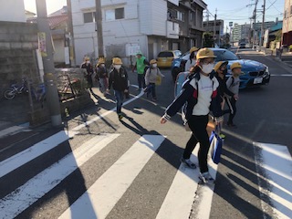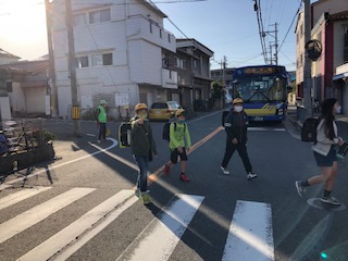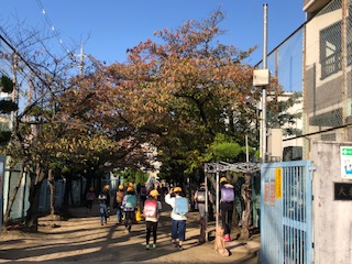 桜の木がすっかり紅葉した下を子どもたちが通って教室へ行きます。