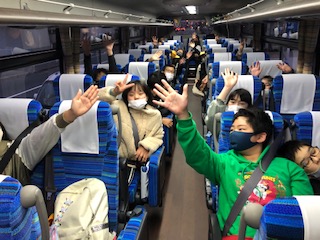 バスで「車内の様子写すよ〜。」で手を振ってくれた人たちです♪たくさんの保護者の皆さんのお見送りをありがとうございました。元気に行ってまいります!
