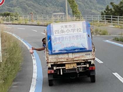 バスに乗り、一路宿舎へ。途中からお出迎えがあり、手を振りながら先導してくれました。先頭車だから見れてラッキー♪