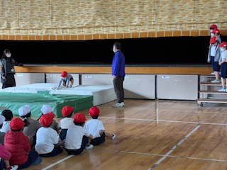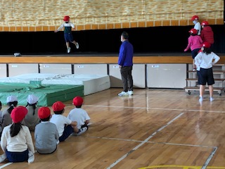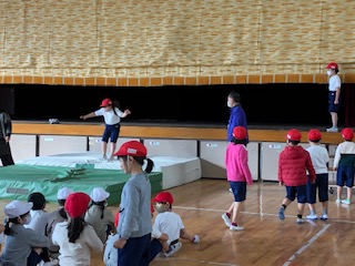 1年3組は体育館で体育をしています。分厚いマットを敷いて、舞台の上からピョーンと飛び降ります。順番に並んで、ポトンと落ちる人、上に思いきり飛び上がって着地する人、みんな楽しそうに「マイ ジャンプ」♪