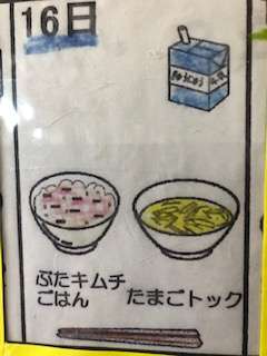 今日はご飯が赤、スープが黄と、色がきれいでした。ほんのりピリッと豚キムチご飯と、トックのふんわり卵スープで食が進む味付けで美味しかったです♪