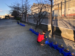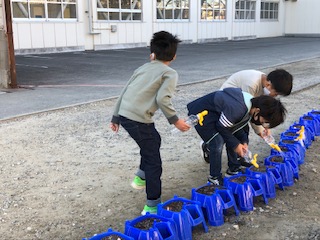 登校してきた子どもたちとすれ違って出てくる1年生、植木鉢に水やりです。まだ何の芽も出ていない植木鉢を大事そうにお世話してます。目が出てくるのが楽しみです♪