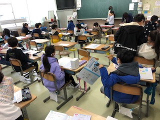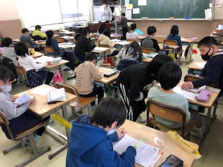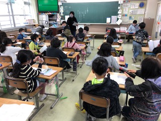 2年生の教室です。今日から担任が交代した3組はテンション高いです。早くどんな先生か知ってくださいね♪2組は国語、1組は算数に取り組んでいました。