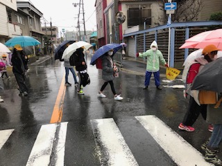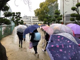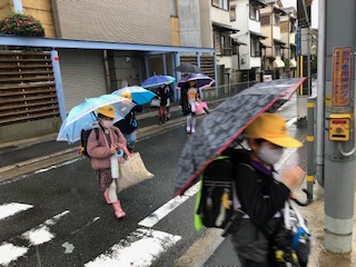 昨夜からの雨が降り続いて運動場もどこに足を置くか迷うほど水溜りがつながっています。こんな月曜日、子どもたちは変わらず元気に登校して来ました♪