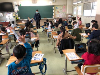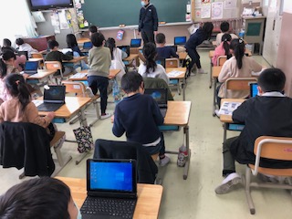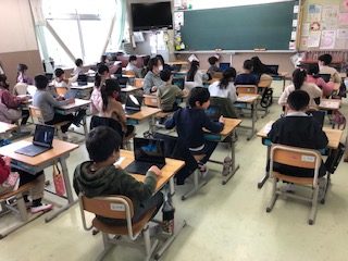1年生でタブレットの授業をしていました。今日が初めてで、全員が保管庫からタブレットを出してきたところで、電源をオンにします。自分の名前が出ましたか?…全員の手が上がりました。一つ一つ丁寧に全員で進むので、揃っています。できた子は、周りの子の進み具合も見る余裕があります♪