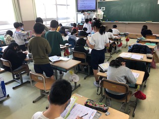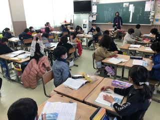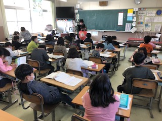 2年生の教室です。全クラスとも国語です。2クラスは「スーホの白い馬」、モンゴルのお話で読んだ後、ズンと重い感動が心に残るお話で、馬の思い、スーホの思いを子どもたちにじっくり味わってほしいものです♪1クラスは漢字のまとめに取り組んでいました。