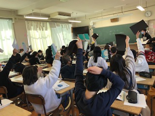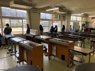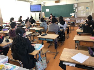 6年生、1クラスは音楽で、教室と音楽室に分かれて珍しい2分割授業です。教室では曲を聞き、メロディと歌詞を学習し、音楽室では、距離と換気を十分にして窓の外に向かって歌唱指導を受けます。ちっちゃく口の中で歌ってみました♪もう1クラスは算数、中学校でこんな問題出たら、学校小学校でやりましたから!」と笑って言えるな、と話しながら先生が出す問題の答えをホワイトボードに書き、答え合わせではみんながホワイトボードをあげて見せています。算数の問題をこんなに楽しそうに取り組む6年生を初めて見ました♪