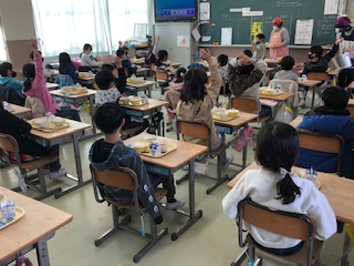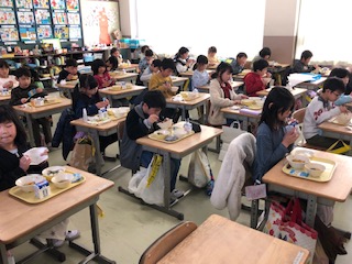 2年生の教室、給食です。「お代わり希望の人〜。」で手を上げている人の席へ食管を抱えて教師が行ってつぎたします♪いただきますの後マスクを外し、静かに給食を味わっています。美味しい〜♪