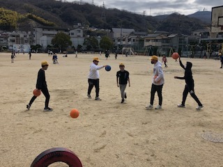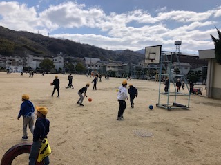 20分休みの運動場です。昨日雨だっただけに今日はたくさんの子どもたちが外にいます♪バスケットのシュート練習が人気です♪