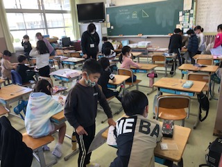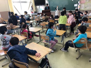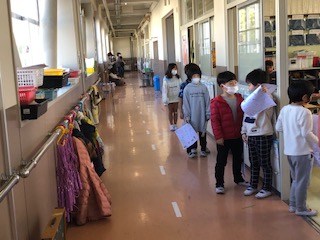 1年生2クラスの様子です。音楽はオルガンに合わせてそれぞれのリズム手拍子が聞こえてきました。もう1クラスでは、算数のテスト、図形のようです。先生のチェックを受けるのに廊下に並びます。給食方式です♪今日は、オープンスクールで来校される保護者の方が1番多いようです。それでもまばらで安心です。