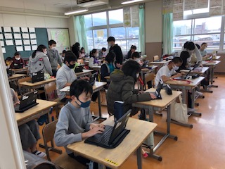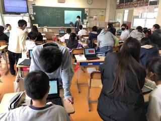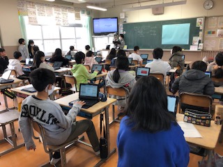 5年のこのクラスはタブレットを活用しての授業です。内容は、「パワーポイントを使ってみよう」です。周りの人たちの進度を確認してサポートする動きが自然で、温かさにあふれていました♪