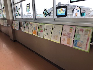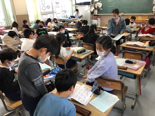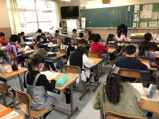 3年生の教室です。1クラスは国語「わたしたちの学校じまん」で、班で発表文を作り、発表分担を相談します。廊下に町探検についての新聞が掲示されていてきれいな彩りです♪もう1つのクラスは算数で「そろばん」の授業でした。日本古来の計算器です。使いこなせるでしょうか♪