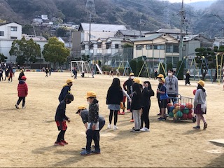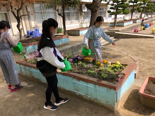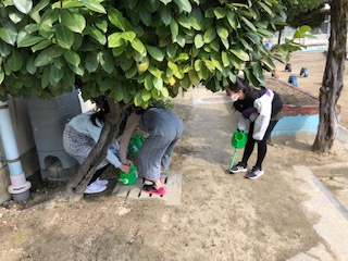 しっぽ取りオニで集まっている子どもたちがいます。栽培委員とそのお手伝いで、雨水タンクの水を利用して、お花の水やりを楽しそうにおしゃべりしながらやっています♪