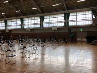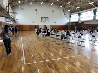 6年の1クラスが体育館にいます。何の授業でしょう…。そうは見えませんが、音楽です♪歌の授業を特別な感染対策で行っています。工夫あるのみです♪
