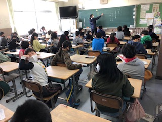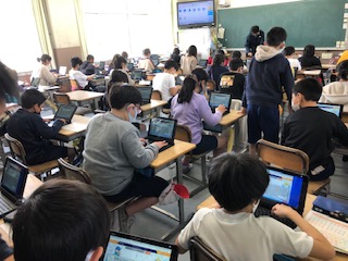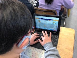 4年生の教室です。タブレット授業は、プログラミングで必要なタイピング練習です。色が変わった文字をタイプして、アルファベットの場所を覚えます。ファイト♪もう1クラスでは、次の体育授業で行うゲームのやり方を聞いています。楽しそうな活動です♪