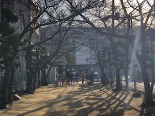 太陽の光の粒が見えるような朝の陽光の中、子どもたちが元気に登校して来ました♪