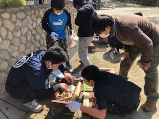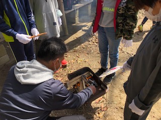 煙を起こしては大事に移す作業に精を出す時間が流れます… …。「ついた!ついた♪」と歓声があがりました♪火起こしに成功した第一号の班、立派な弥生人です♪