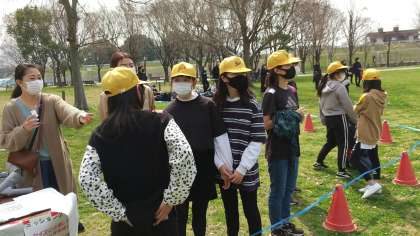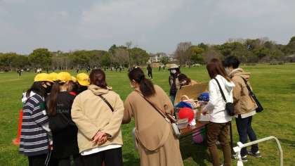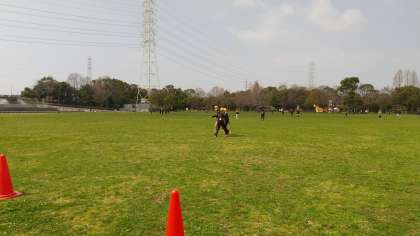 深北緑地の6年です。保護者の方もたくさん参加されています。ハンターが始まっています。スーツにサングラスの担任が鬼となって逃げる子どもたちを追うゲームですが、この緑地の広さを駆け回るのは大変…過ぎます。でも楽しそうです♪