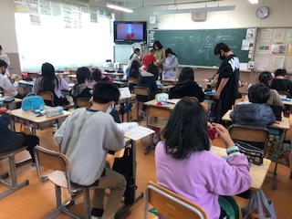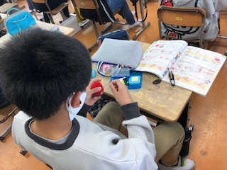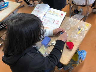 5年生のこのクラスは家庭科です。イチゴを作っているようです。針や糸の扱いにもずいぶん慣れた様子でそれぞれに縫い進めています♪