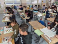3年の教室です。1クラスは、割り算の練習問題を全員が解ける、がめあてです。廊下に解き方のプリントが貼ってありそこで答え合わせをしたり、学ぶこともOKです。先生にチェックを受けに行く人もいます。それぞれのリズムでOKです♪1クラスは音楽、今日もリコーダーの学習…吹けませんが、音階の練習ができます♪
