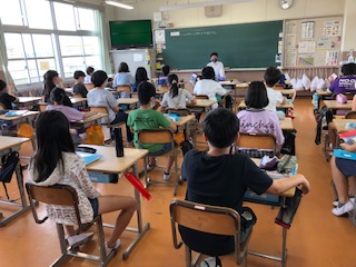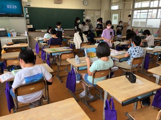 5年生の2クラスです。算数のクラスは、先生が話し始めたところですが、波を打ったかのように静かで素晴らしい集中です。もう1クラスは社会、調べ学習のための本をそれぞれ選んで自席に準備します。