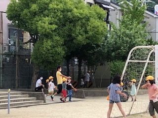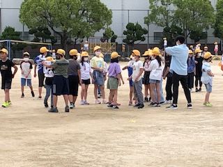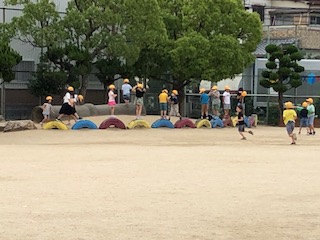 運動場の真ん中では、4年の1クラスが「みんな遊び」に出ています。端の方には1年生がおり、どうやら虫探しのようです。タイヤや土管のコーナーも子どもたちには人気です♪今日も4、5名の先生たちが運動場に出て、子どもたちと過ごしています。