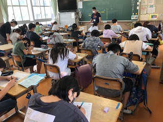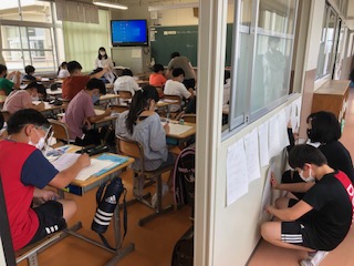 6年生の2教室です。どちらも算数のようです。1クラスは、プリントに向かって集中、もう1クラスは算数の学び合い、まずは独力で課題をこなしているところ、廊下では、やり終えた人が答え合わせと、解き方の違いがあるかを学んでいます♪