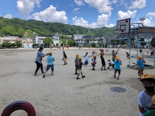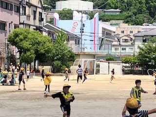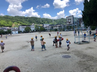 昼休みの運動場です。昼過ぎですが、雲と風のおかげか、暑さが和らぎ、外で尻尾取りオニや運動ができます。先生たちも外に出ています♪