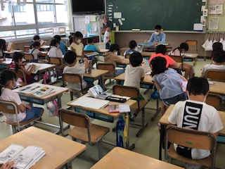 2年生の教室です。1クラスは算数、目盛を読む学習です。1クラスは図書、今年もコロナ対策のため、図書室から借りてきた本を教室で読みます。言葉に親しみ、お話の世界に心を膨らませて欲しいと思います♪1クラスは体育、プールの授業を教室で行っています。「けのび」についての学習です。今年もプールに入らず残念…