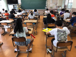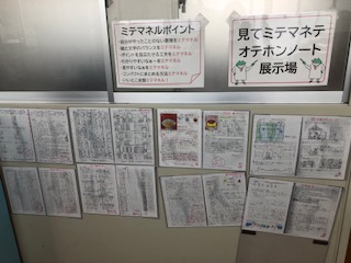5年生のこのクラスは図書の時間で、図書室から借りてきた本を読んでいます。シーンと静かな教室です。廊下には、自主学ノートの紹介です。それぞれ見やすくて工夫されています。大学いもやプリンの作り方があり、楽しいです♪