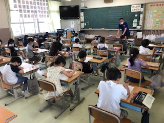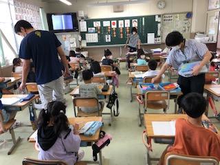 1年生の2クラスはどちらも国語、伸ばして言う言葉は「う」や「あ」を書く。例えば「ふーせん」は「ふうせん」と書きます、を学習するクラス、と、濁音のひらがな「ばびぶべぼ」を学習するクラスです。