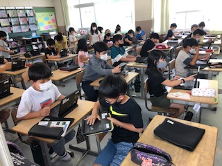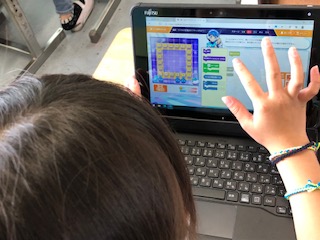 4年生、お隣のクラスでもタブレットを持ってきて開き始めました。20分休憩ですが、子どもたちはもう始めていました。ゲーム感覚で楽しくできますがプログラミングの思考が入るようです♪