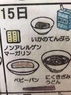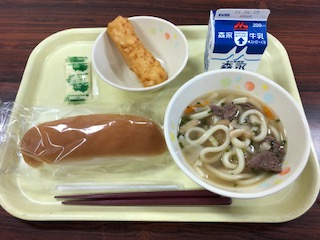 今日の給食、美味しいうどんに赤身の牛肉が入って一層リッチな仕上がりです。一見ちくわですが、イカの天ぷらでした。味のある衣がサクッと揚がって軽い口当たりです♪今日はパンにマーガリンが付いているのが嬉しく思いました。