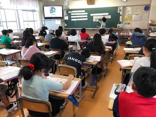 6年生の教室です。1クラスは外国語、どこへ(外国)行きたいか、と答え方である◯◯へ行きたい。????できる。という英語の表現を学んでいます。