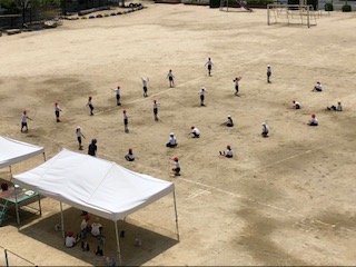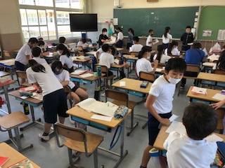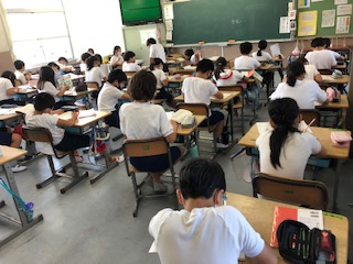 4年生の様子です。1クラスは運動場で体育、距離を十分空けて活動します。まだ気温はそれほど上がってはいませんが、見学者はテントにいます。2クラスは国語で手紙を書いています。自分のおじいちゃんや、仕事で遠くに行っているお父さんに書いている人がいました。なんで書こう、と一生懸命考えながら少しづつ筆を進めます。