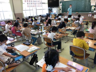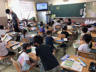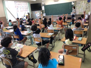 1年生の教室です。1クラスは国語、「バビブベボ」の濁音がつく言葉探しです。たくさんの手がサッと上がり、姿勢も良く肘も伸びて頼もしい挙手です♪1クラスは算数、文章を読んでそこに足し算があるのを見つけて足します♪1クラスは国語、黒板に「おもちや」と「おもちゃ」と書いてあります。一字違いで大違いです。子どもたちは楽しく学んでいます♪