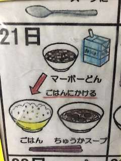今日は中華です。スープには生姜か何か入っているのか、ひと味違っていて美味しいです。マーボー丼は豆腐ではなくナス、ナスがとてもマーボに合っています♪