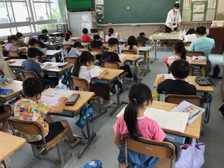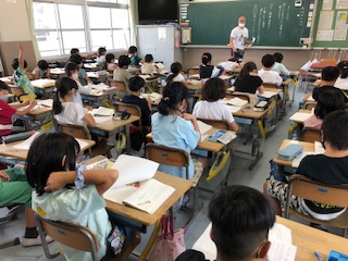 3年生の教室です。1クラスは子どもたちの3種類の取り組みが見れます。きっと理科のテストに取り組んで、終わった人は、国語のプリントを仕上げ、それも終わった人は本を読んでもいいのでしょう。1クラスは国語「まいごのかぎ」を読み進めています。手を上げている人の意欲が伝わります。